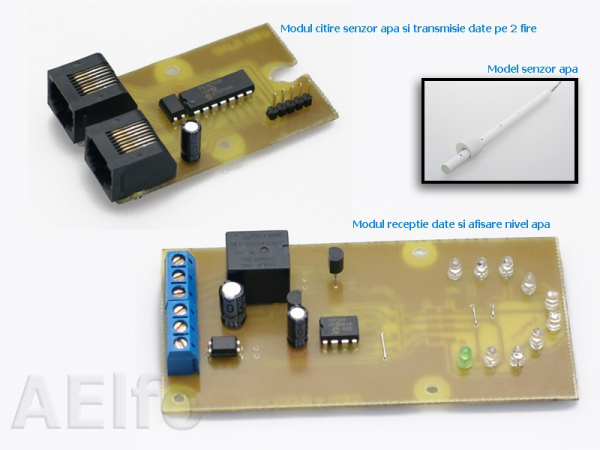 Montajul permite citirea nivelului apei dintr-un bazin de mare capacitate si in functie de nivelul apei poate comanda mai multe dispozitive cum ar fi: pompa care umple bazinul cu apa, electrovana pentru udat gradina, electrovana pentru apa menajera.